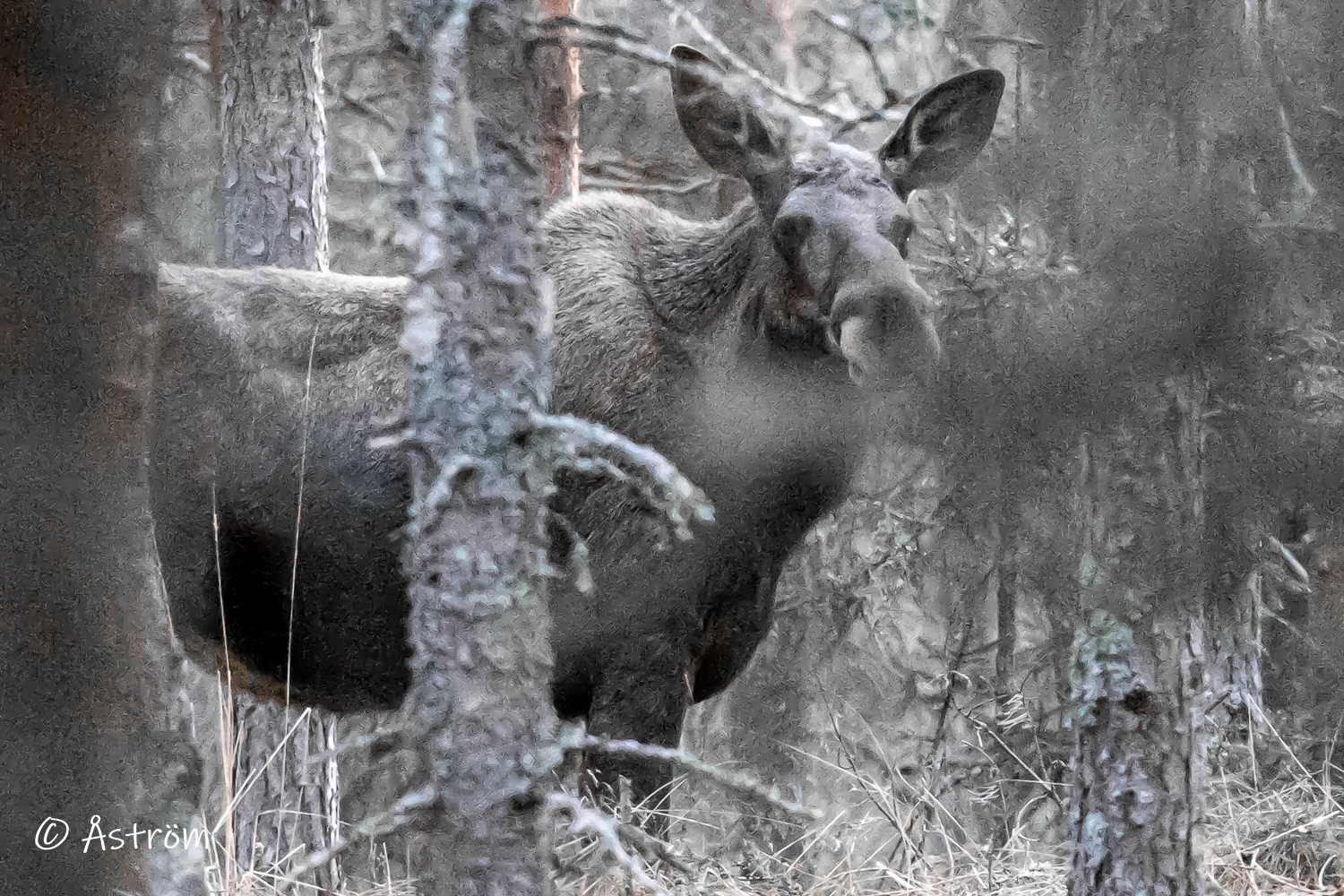 De två sista bilderna på tranan respektive älgen tog jag från bilen på väg hem. Älgen tittade misstänksamt på oss och undrade säkert vad vi var för lustiga figurer som riktade ett stort öga mot den. Bildkavlitén på den är så där men den får vara med i alla fall.